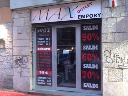 Max Empory Outlet di Simone Ferrante in via E.Fermi, 12 e MastroInchiostro hanno lavorato insieme ad un piccolo restyling dello shop, con vetrofanie e vari tipi di stampe per i saldi del 2011.